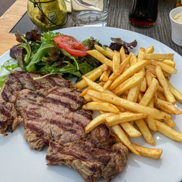 Churrasquito 240grs, acompañado de arroz, ensalada, papa francesa, sopa y jugo.