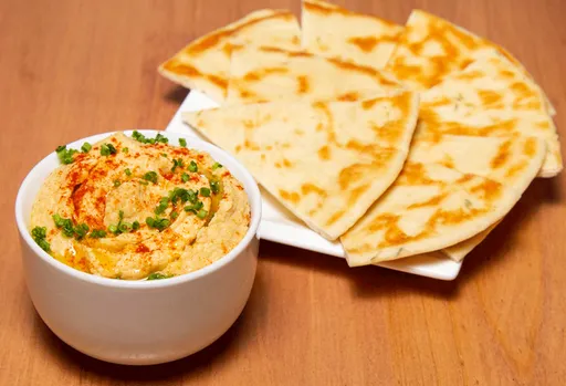 Carne de res, arroz rojo, ensalada de zanahoria y repollo, hummus y pan pita.