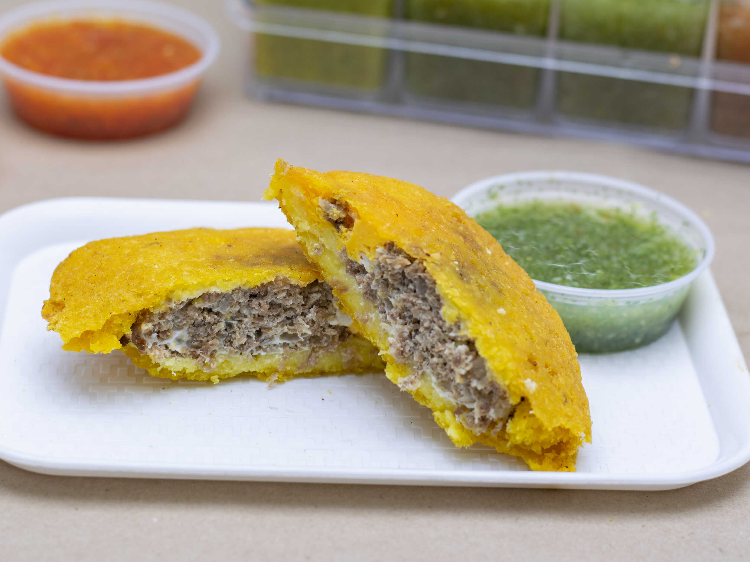 Empanada de 100g, masa de maíz, rellenada de papa y carne desmechada.