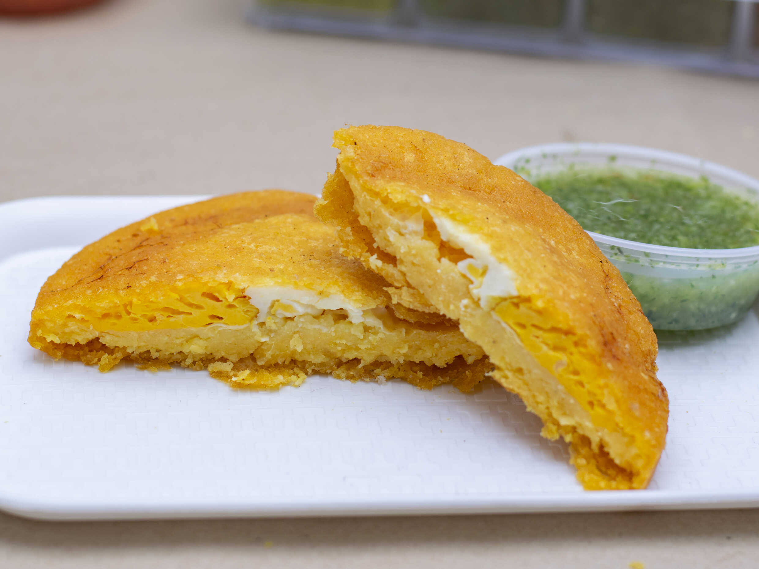 Empanada de 100 g, masa de maíz, rellena de papa, carne desmechada y ají.