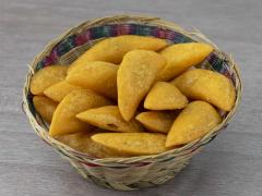 Empanadas de 70 g con masa de maíz, rellena de papa y carne desmechada.