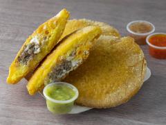 Empanadas de 70 g con masa de maíz, rellena de papa y carne desmechada.