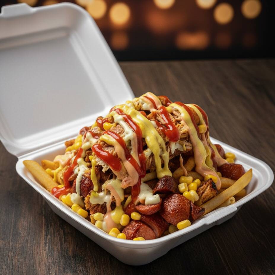 Papá a la francesa, queso, salchicha, tocineta, mazorca carne despechada, pollo despechado, choricito y huevo de codorniz.