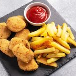 5 nuggets con porción de papas a la francesa, ideal para una persona.