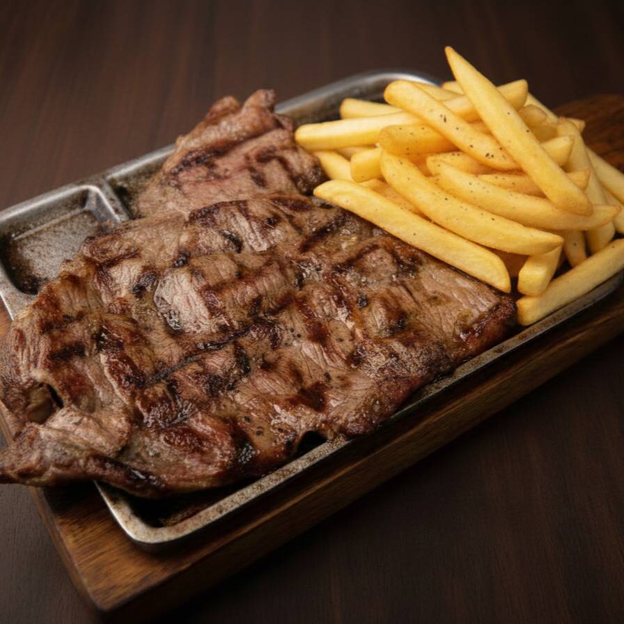 Churrasco de 350 g, papá a la francesa y huevo de codorniz.