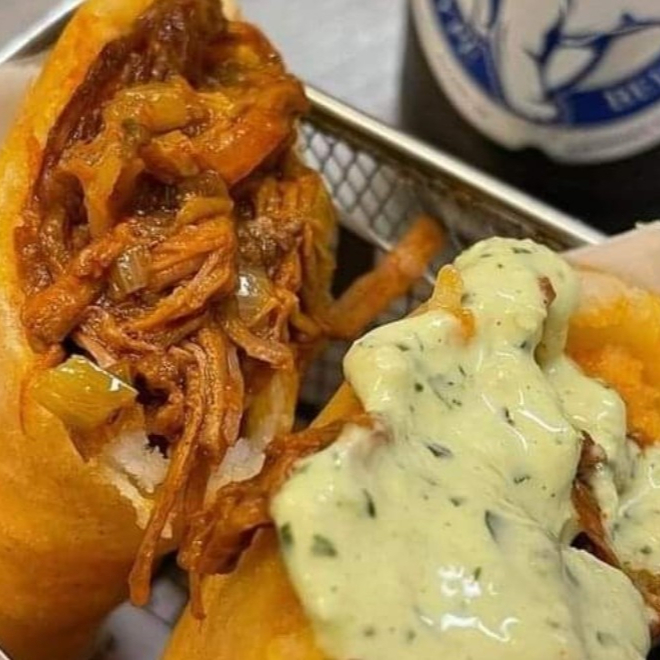 Trozos de cerdo seleccionados acompañados de queso fundido que se estira en cada bocado.