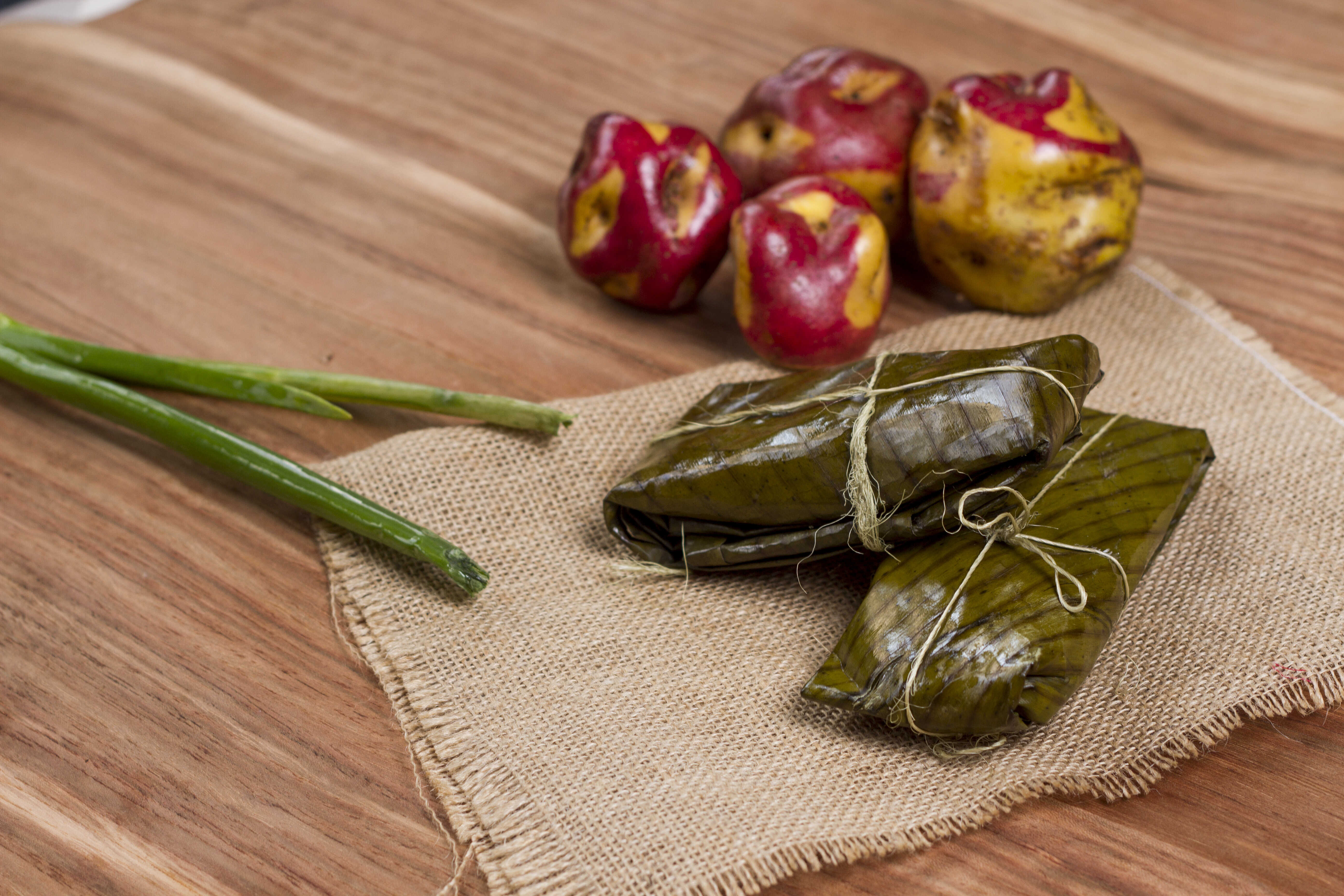 Tamales de papa colorada, maní tostado y molido, con carne de cerdo. Se acompaña con ají de maní.