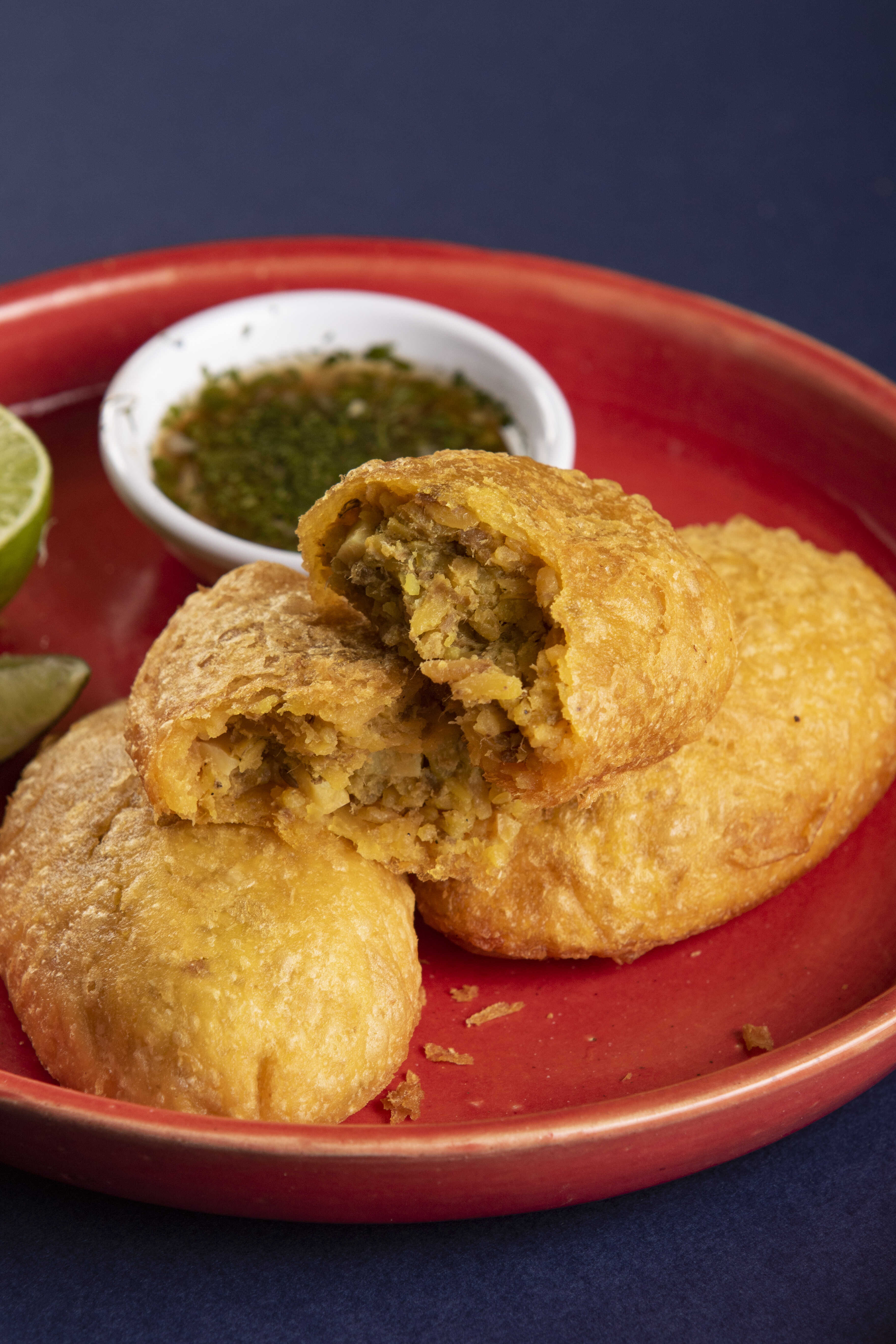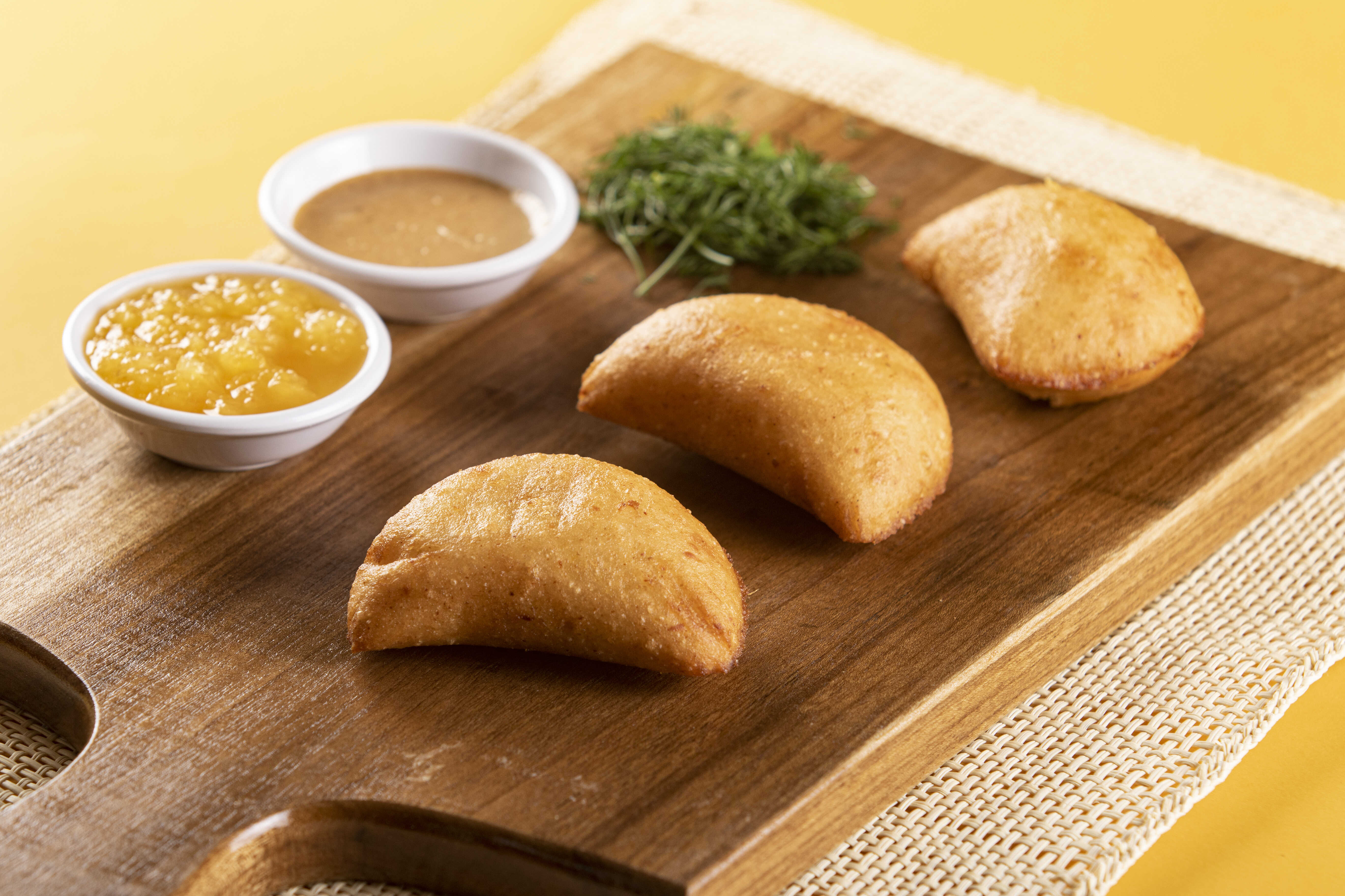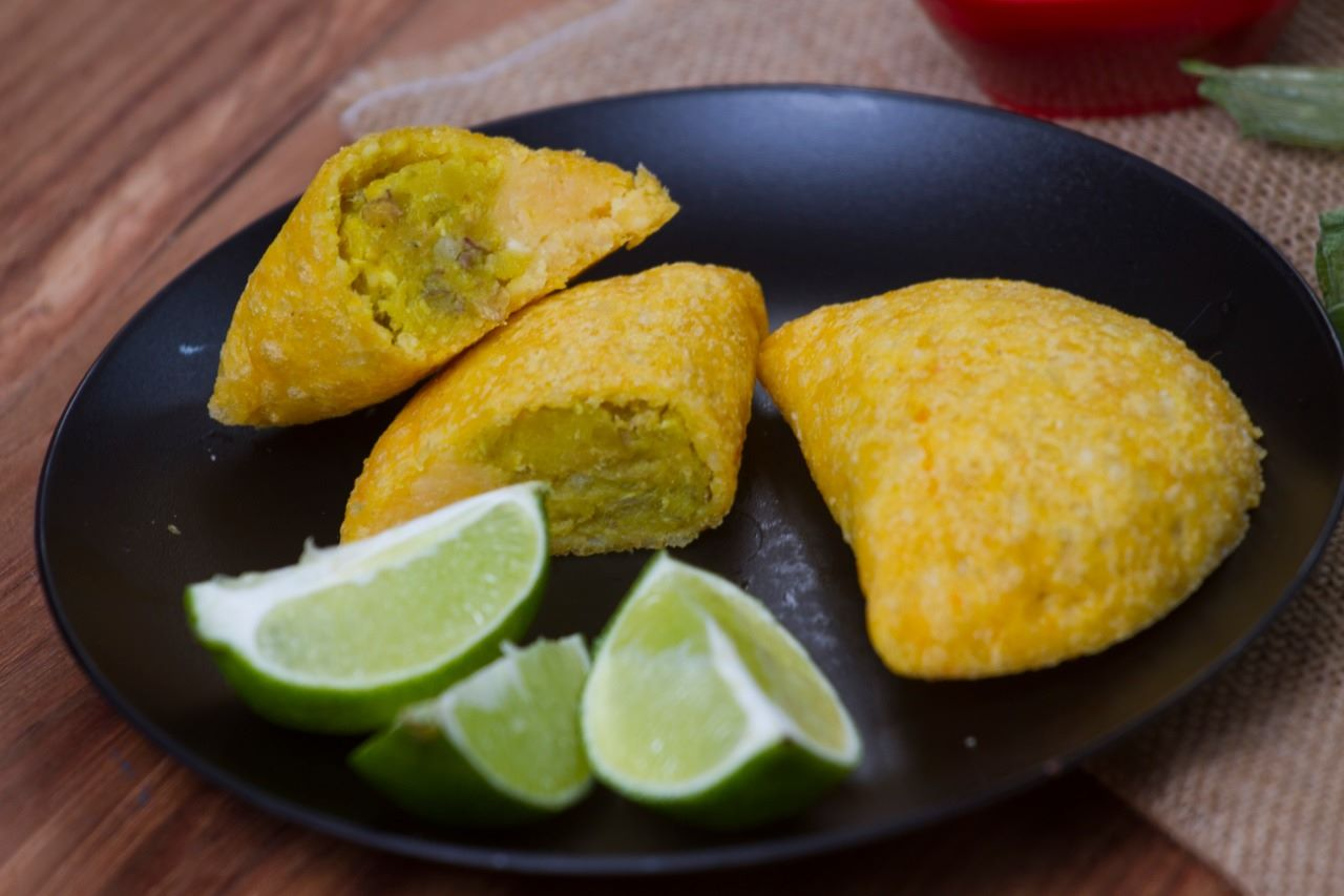 Empanada rellena de papa blanca y amarilla con carne picada. Se recomienda acompañarla con ají criollo o limón.