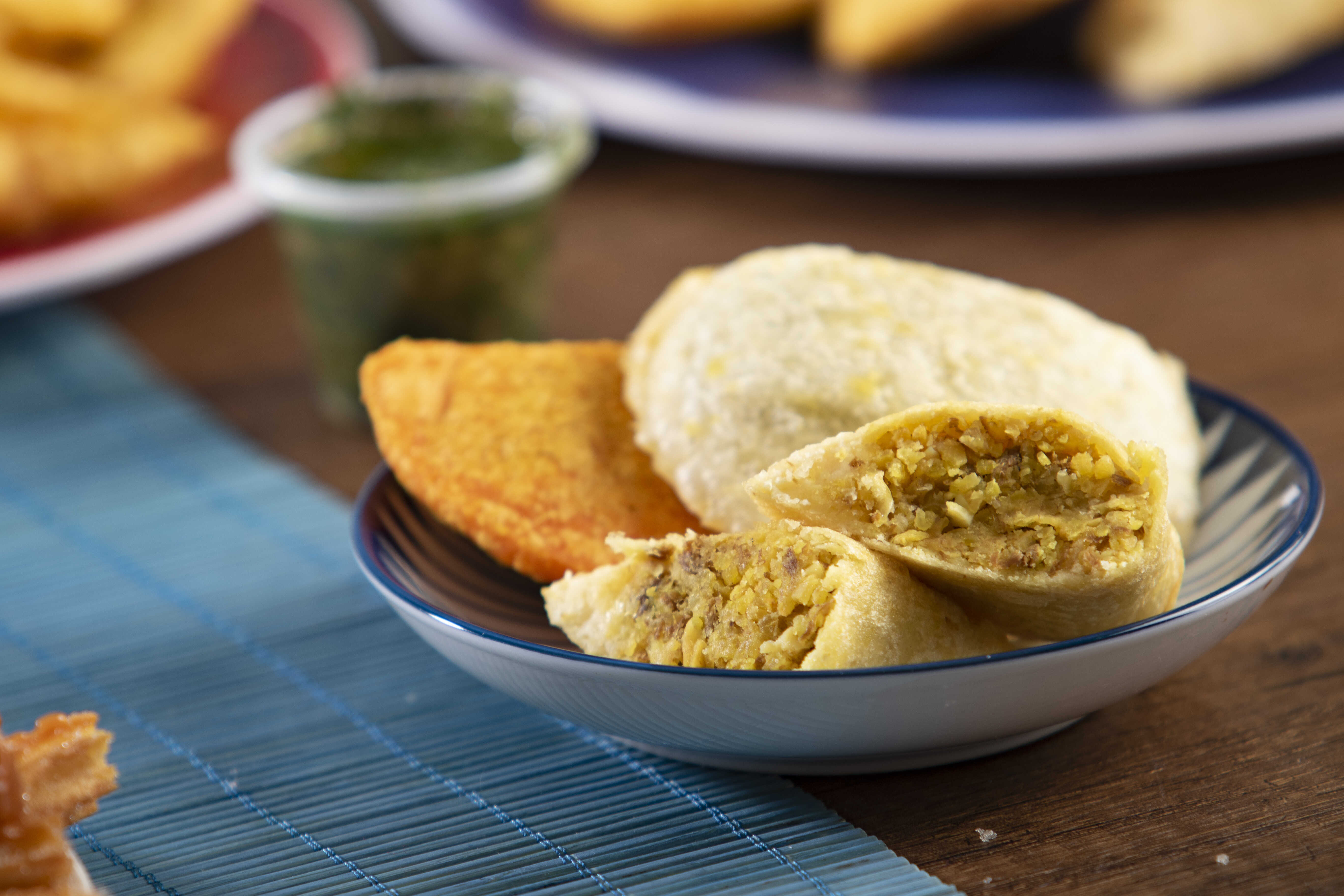 Empanada elaborada con masa de maíz y yuca, rellena de papa blanca y amarilla, con carne desmechada.