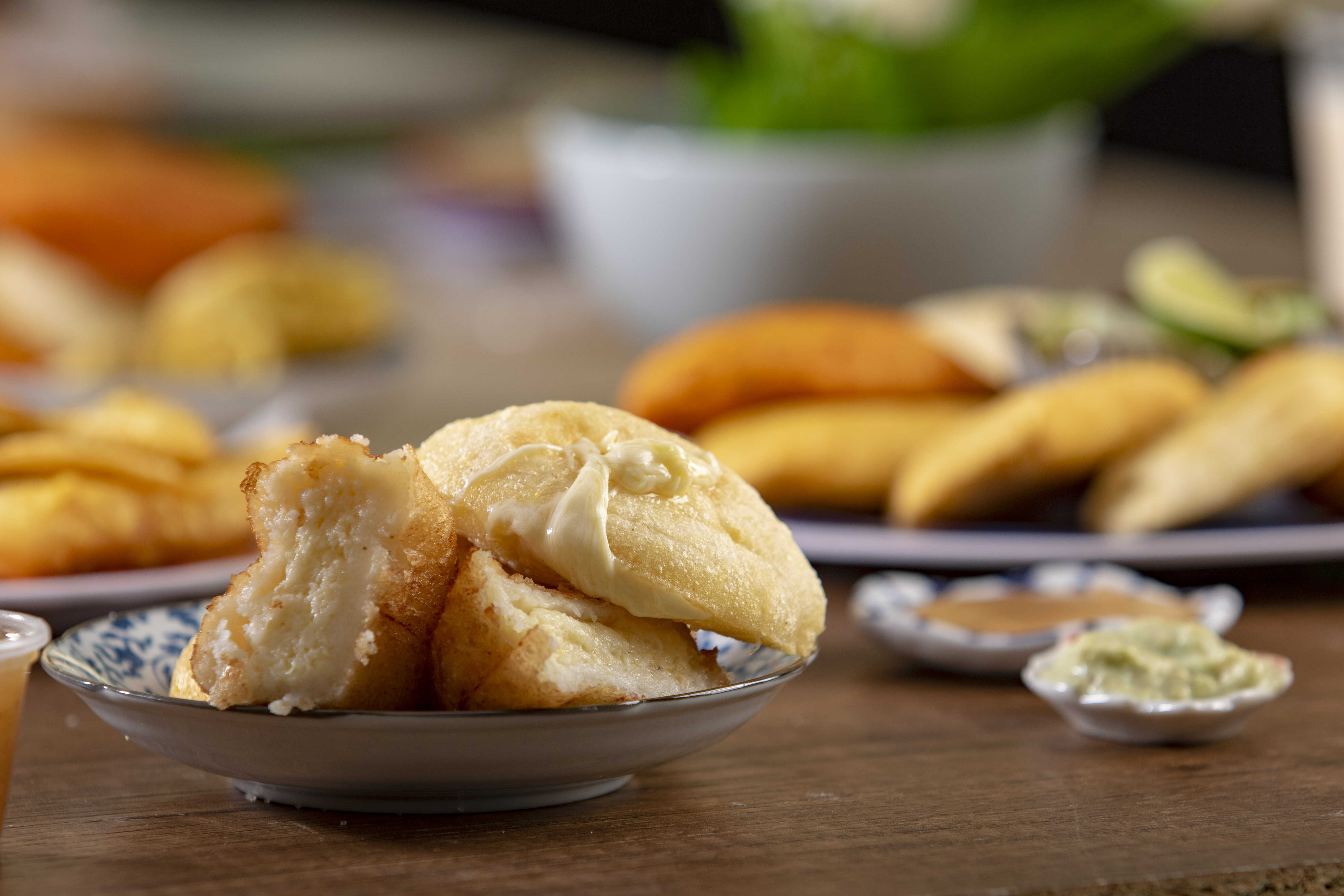 Empanada con masa salada de maíz y yuca, rellena de queso.