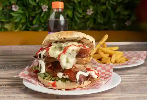 Combinacion de carne de res y pechuga en salsa grille tomate , lechuga y queso mozarella , papa a la francesa y bebida a elegir.