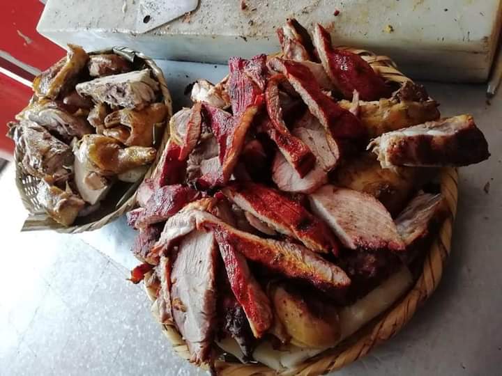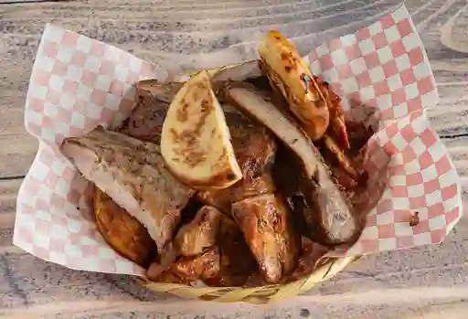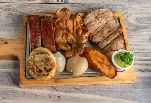 Carne al barril, res a la parrilla, lomo de cerdo al horno acompañado de papa salada, plátano,arepa boyacense guacamole y ají.
