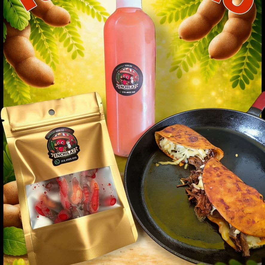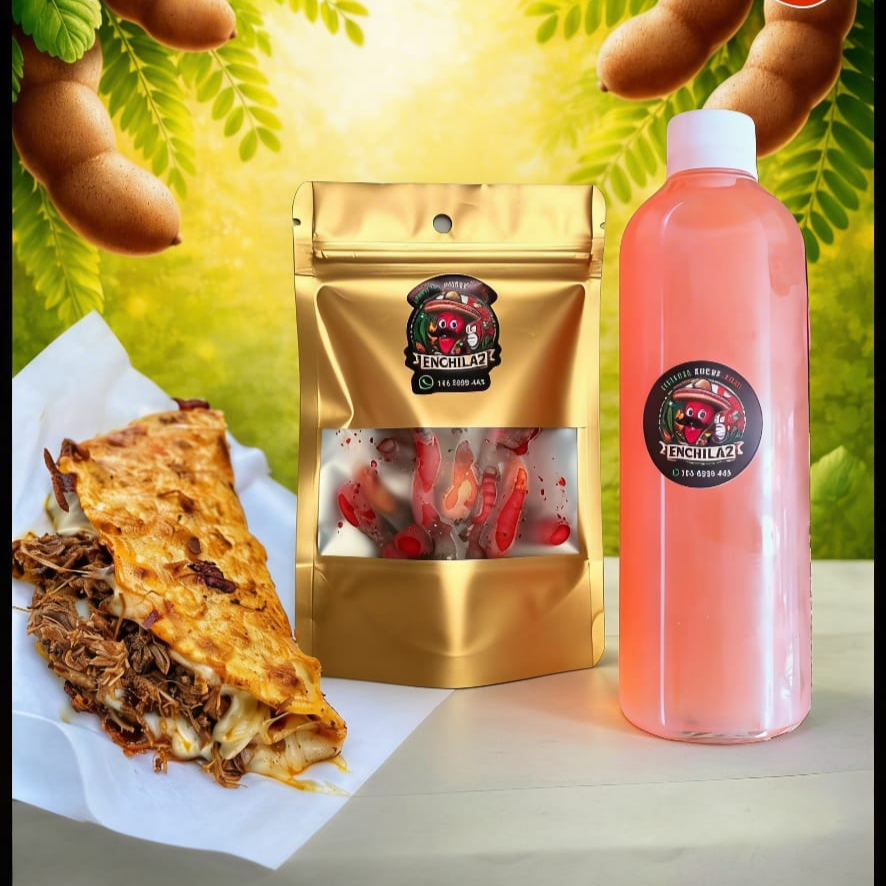 DOS 2 quesadillas de birria (tortilla rellena de carne de res, queso, limon,cilantro,cebolla) UNA 1 Botella de agua de Tamarindo 250 ml y UNA 1 bolsa de gomitas enchiladas POCO picosas de 40 Gr