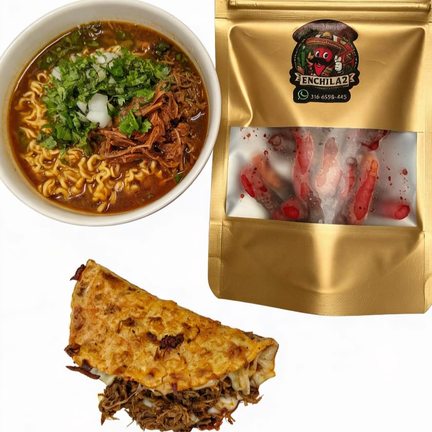 UN 1 (Birriamen consome de birria 24 onzas con carne de res y ramen,cilantro cebolla y limon) UNA 1 quesadilla de birria (tortilla rellena de carne de res, queso, limon,cilantro,cebolla) y UN 1 paquete de gomitas enchiladas POCO picosas de 40 Gr