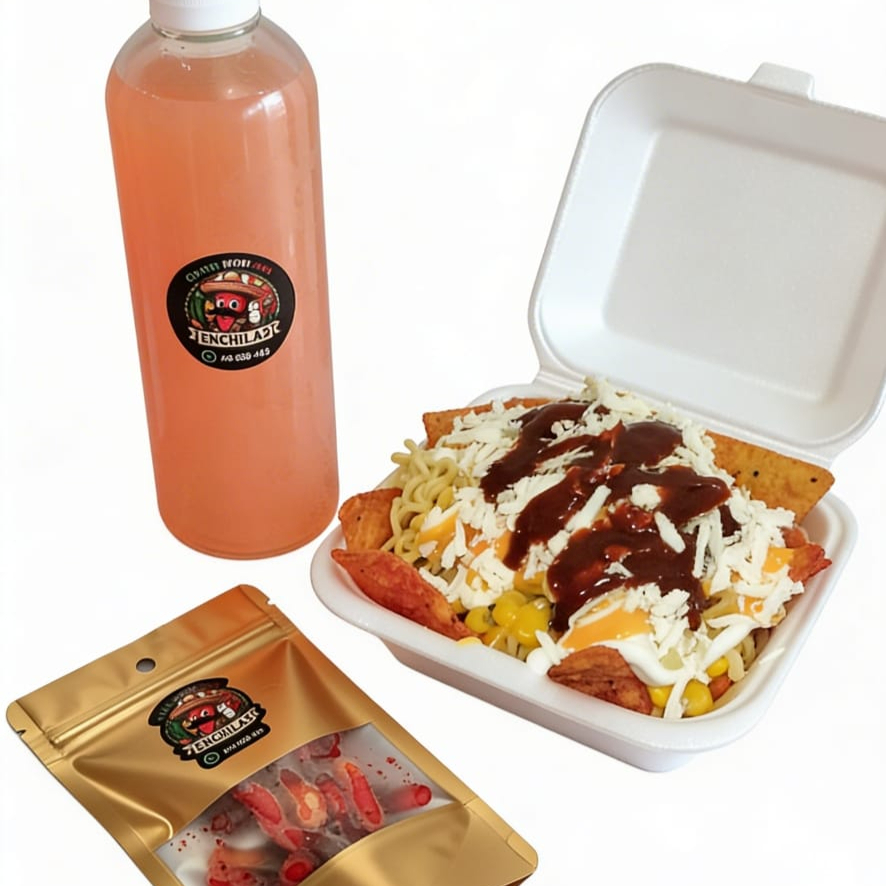UN 1 Ramen con mazorca mexicana dulce y picosa, doritos Flamin Hot, queso blanco y amarillo, salsa Mayolimon, Chedar y Chiles en Polvo para dar el toque picante, UNA 1 Botella de agua de Tamarindo de 250mL y UNA 1 bolsa de gomitas enchiladas POCO picantes de 40 Gr