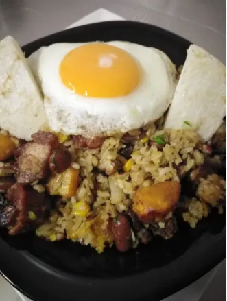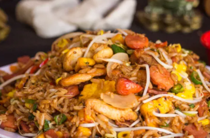 delicioso arroz soofrito con vegetales frescos cerdo pollo y jamon gaseosa 400 o agua con papas ala francesa