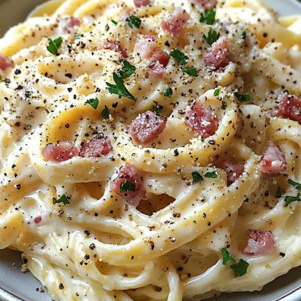 Spaghetti Carbonara cremosa preparacion con tocineta cebolletas yemas crema de nata especies con pan baguete gaseosa o agua