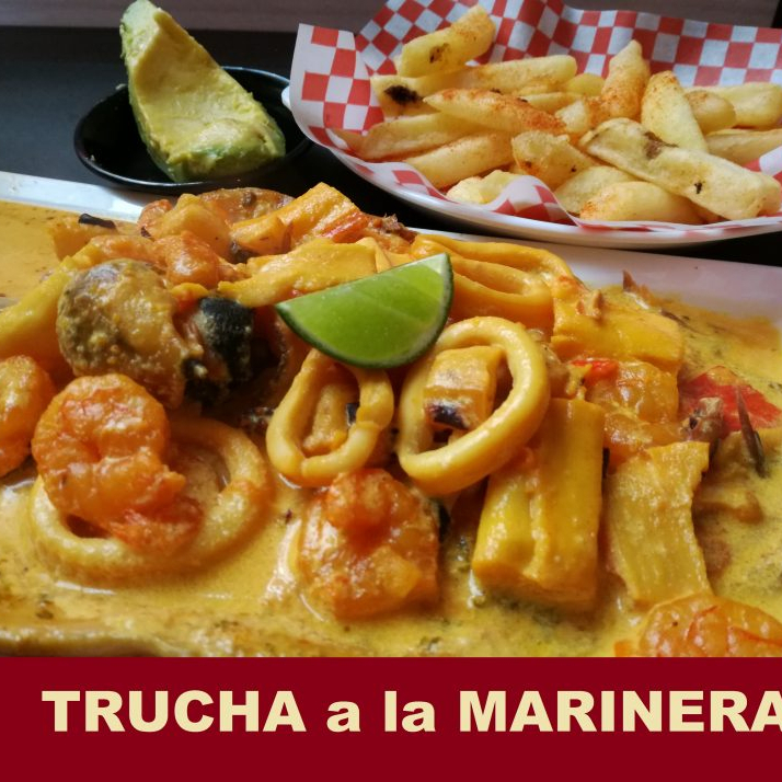 filete de trucha ala parrilla bañado en salsa de frutos de mar con ens. pure gaseosa 400 o agua