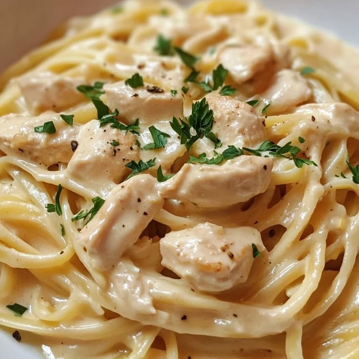 Spaghetti en cremosa salsa alfredo con pollo especies crema de nata y Baguette gaseosa o agua