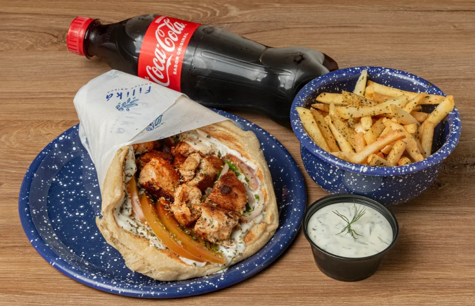 Sándwich griego de pan pita artesanal con proteína a elección (120 g), tomate, cebolla, perejil, salsa de yogur, acompañamiento y bebida a elección.