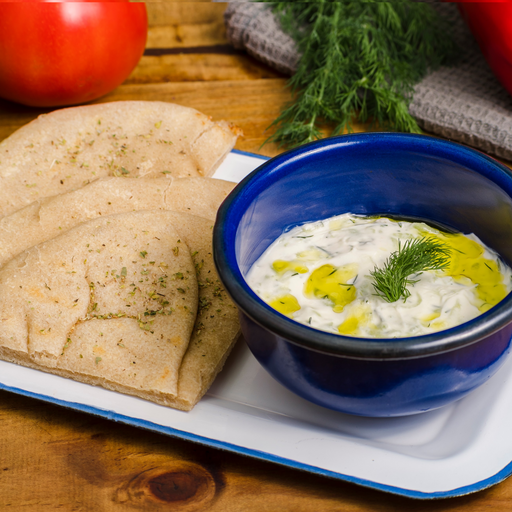 Dip de yogur griego, pepino, ajo, eneldo y aceite de oliva extra virgen acompañado de pan pita.