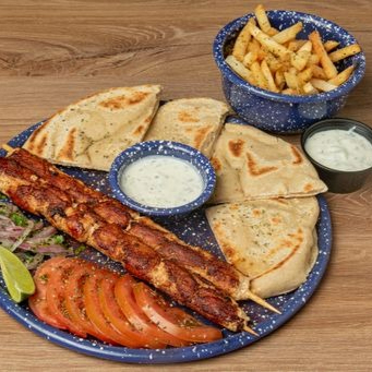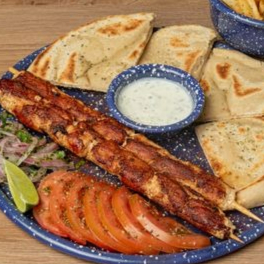 2 Brochetas de pollo (240 g) marinadas en nuestras especias, acompañadas de pan pita artesanal, vegetales frescos y salsa de yogur.