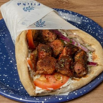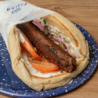 Sándwich griego de pan pita artesanal con kebab de cordero (120g), tomate, cebolla.