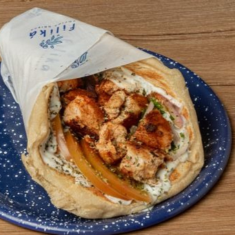 Sandwich griego de pan pita artesanal con 120g de pollo, tomate, cebolla, perejil y salsa de yogur.