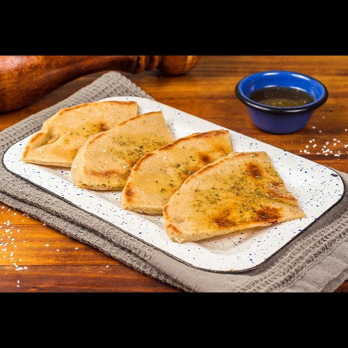 Porción de pan pita artesanal con aceite de oliva extra virgen y orégano.