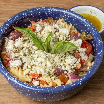 Pasta fusilli, tomate cherry, pimentón, cebolla morada, aceitunas, alcaparras, queso feta, albahaca fresca, aceite de oliva extra virgen.