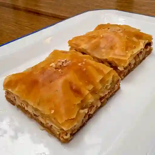 2 piezas de baklava con hojaldre filo, almíbar y almendras.
