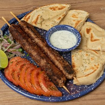 2 Brochetas de kebab de cordero (240g) marinadas en nuestras especias, acompañadas de pan pita artesanal, vegetales frescos y salsa de yogur.