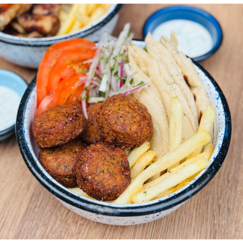 Proteína a elección, pan pita artesanal, tomate, pepino, cebolla con perejil, papas y salsa de yogur.