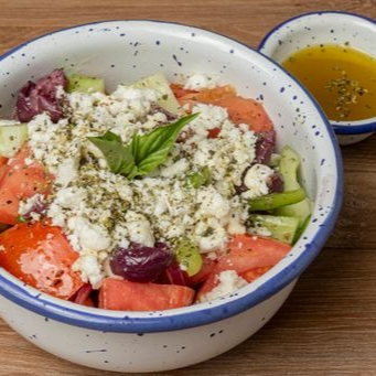Tomate, pepino, pimentón, cebolla morada, aceitunas, queso feta, orégano, aceite de oliva extra virgen.