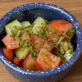 Ensalada de tomate, pepino, albahaca fresca y aceite de oliva extra virgen.