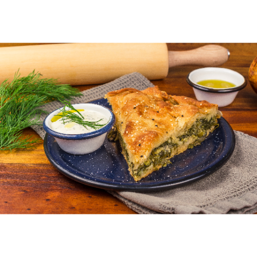 Pastel tradicional griego de espinaca, puerro, hierbas frescas y queso feta acompañado de salsa de yogur.