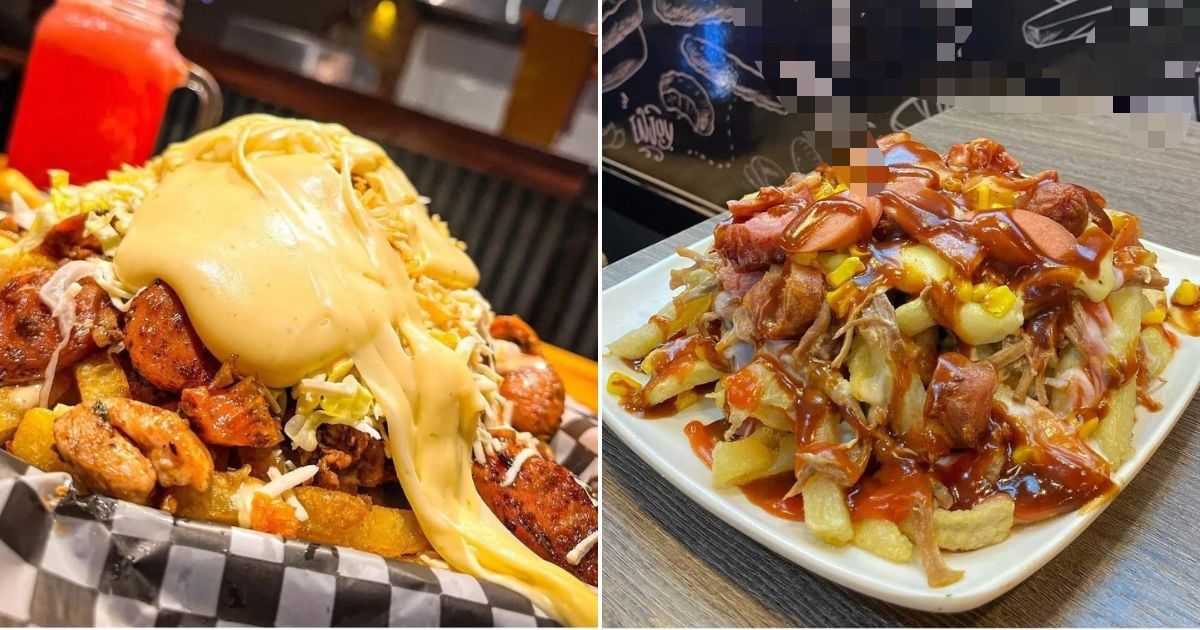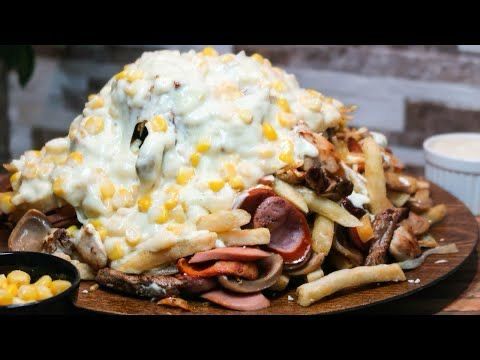 Salchipapa con salchicha long, papa a la francesa, jamón, pollo, champiñones, queso y huevos de codorniz.