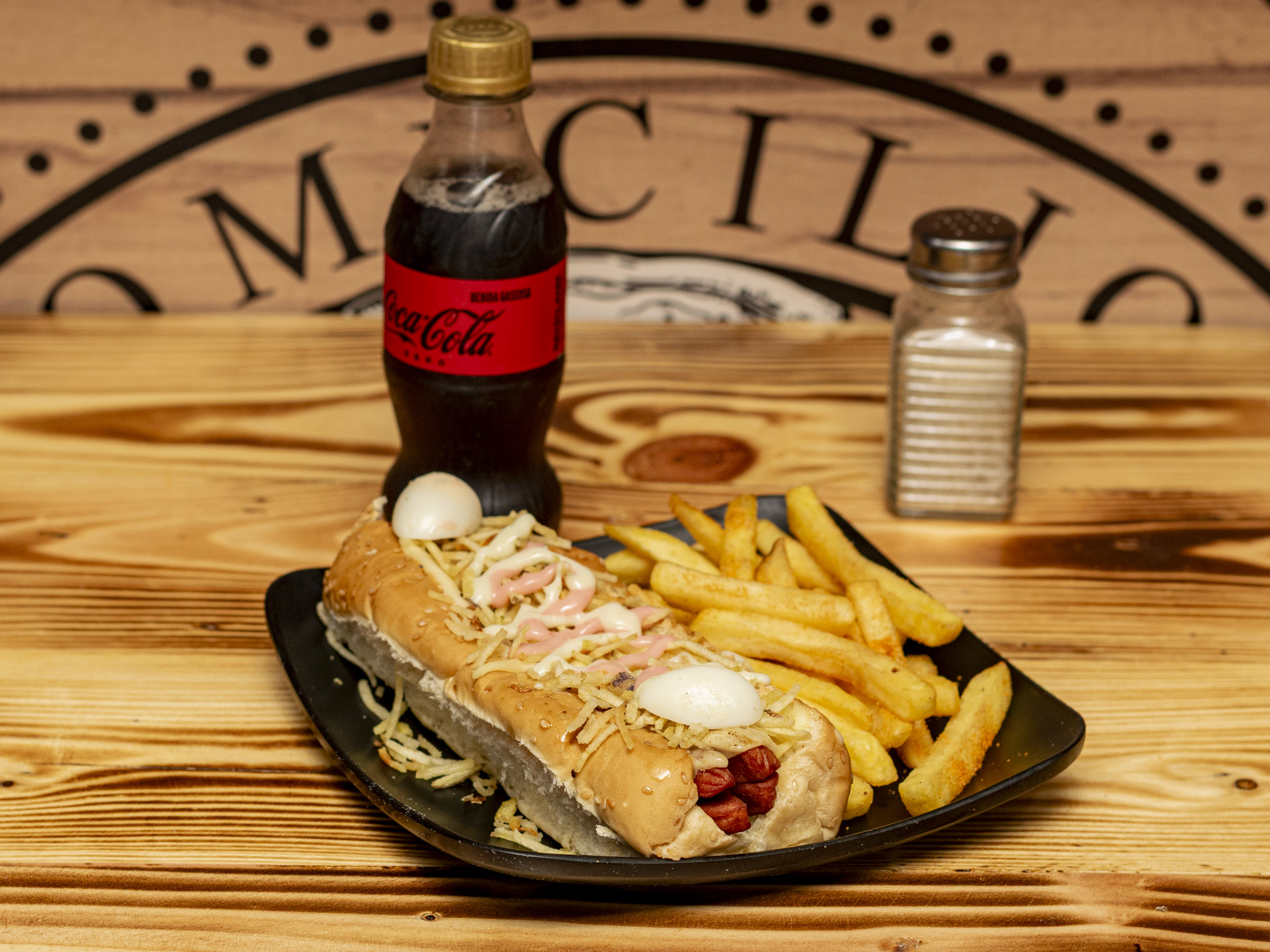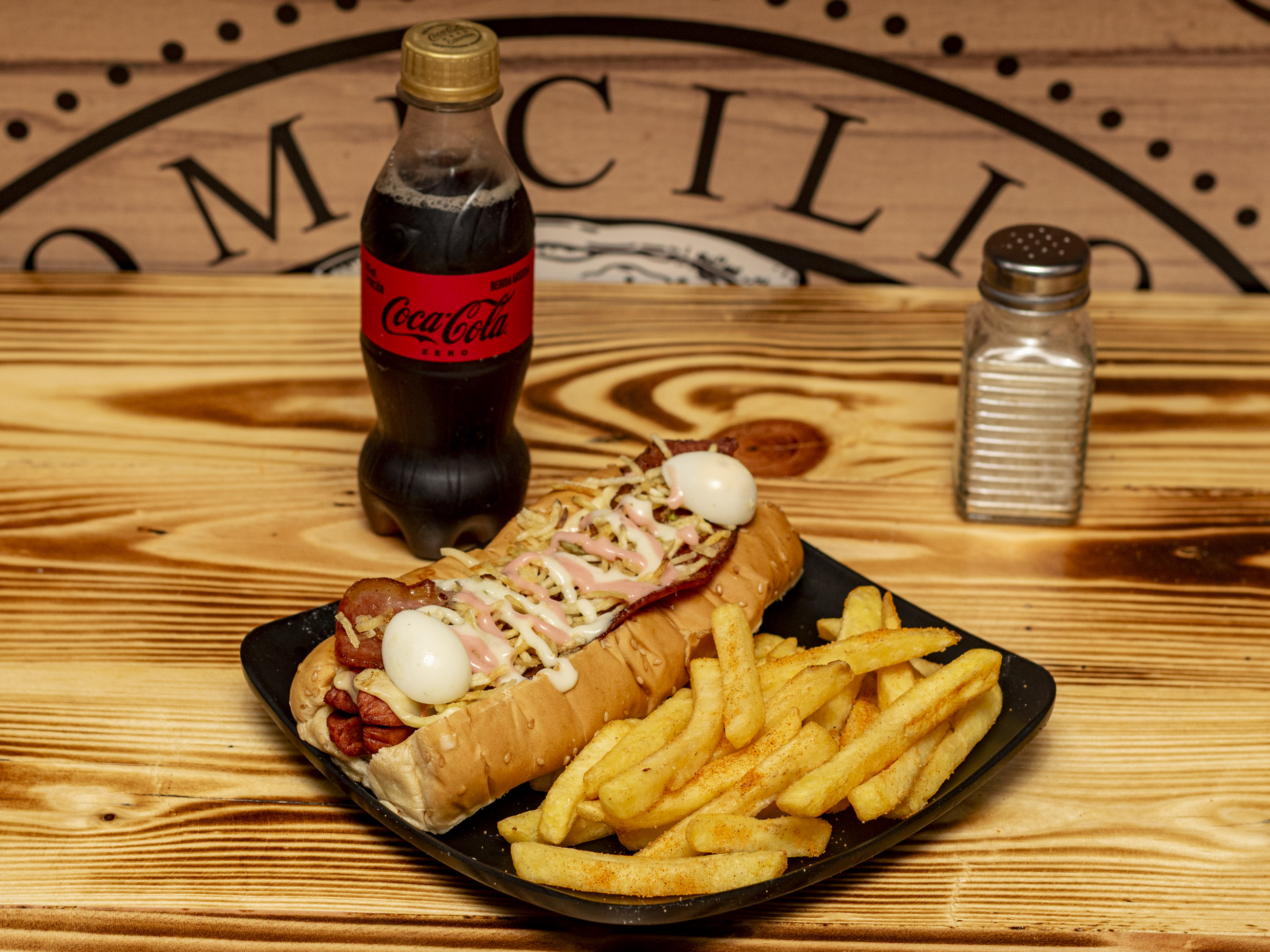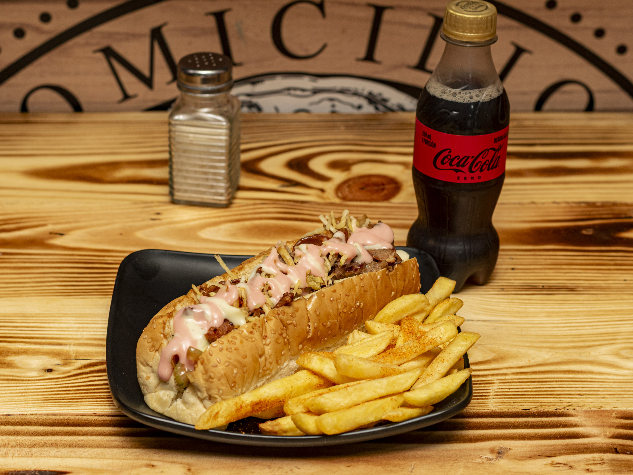 Salvajada Personal: Salchicha, carne, pollo, chorizo, butifarra, lechuga, queso, papa chips, papa francesa y salsa de la casa. + Coca-Cola Zero 250 ml