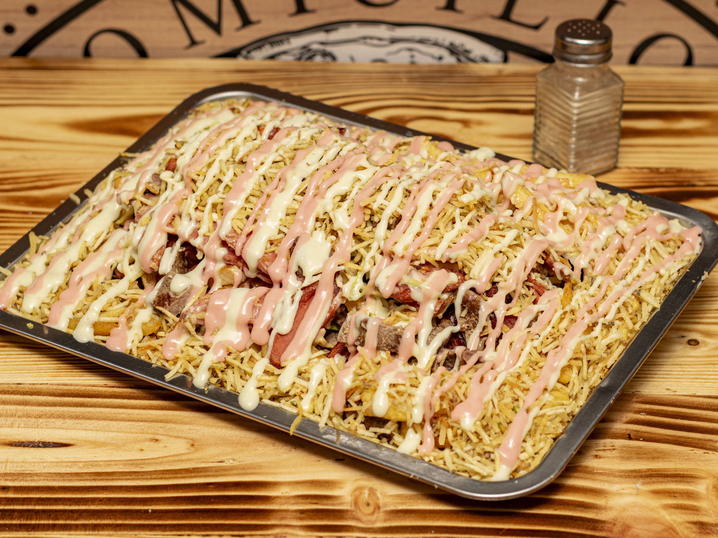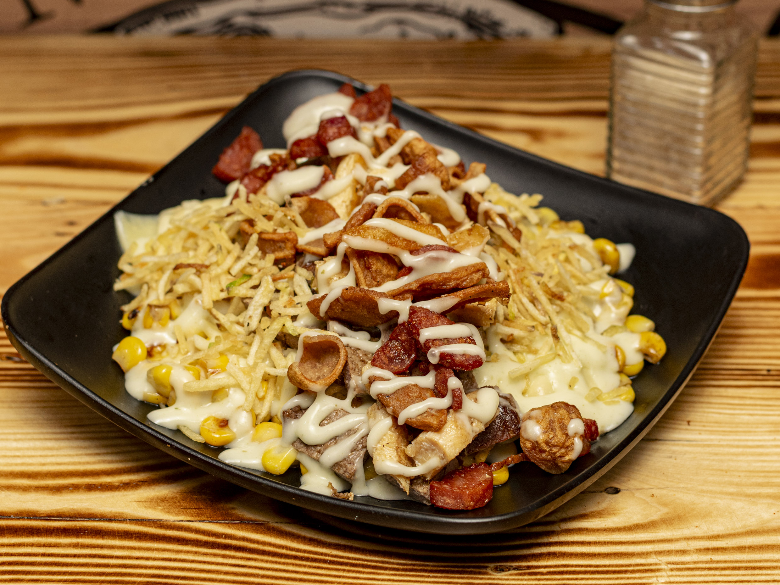 Pollo, carne, champiñón, queso, salsa de la casa y papa chips.