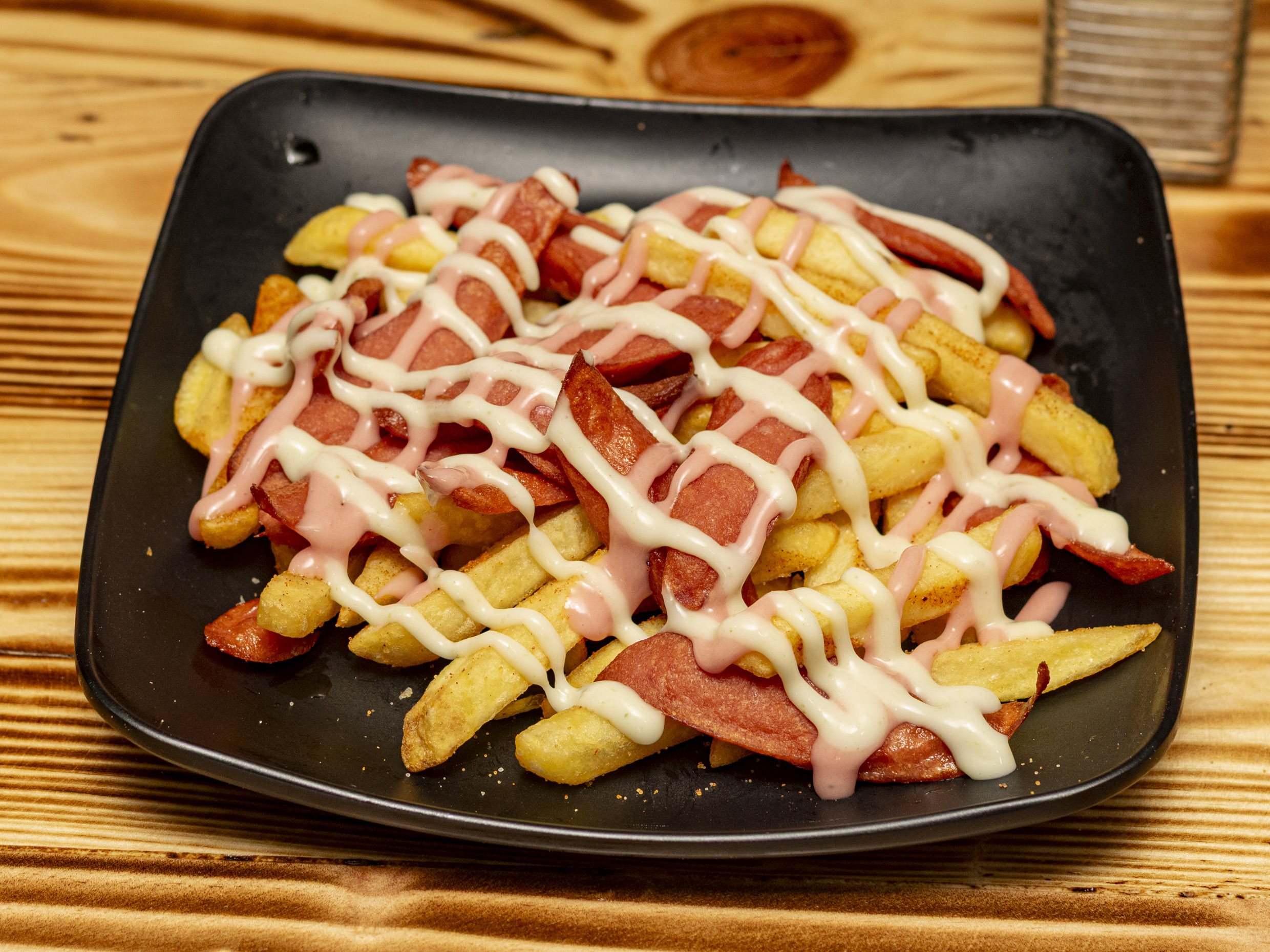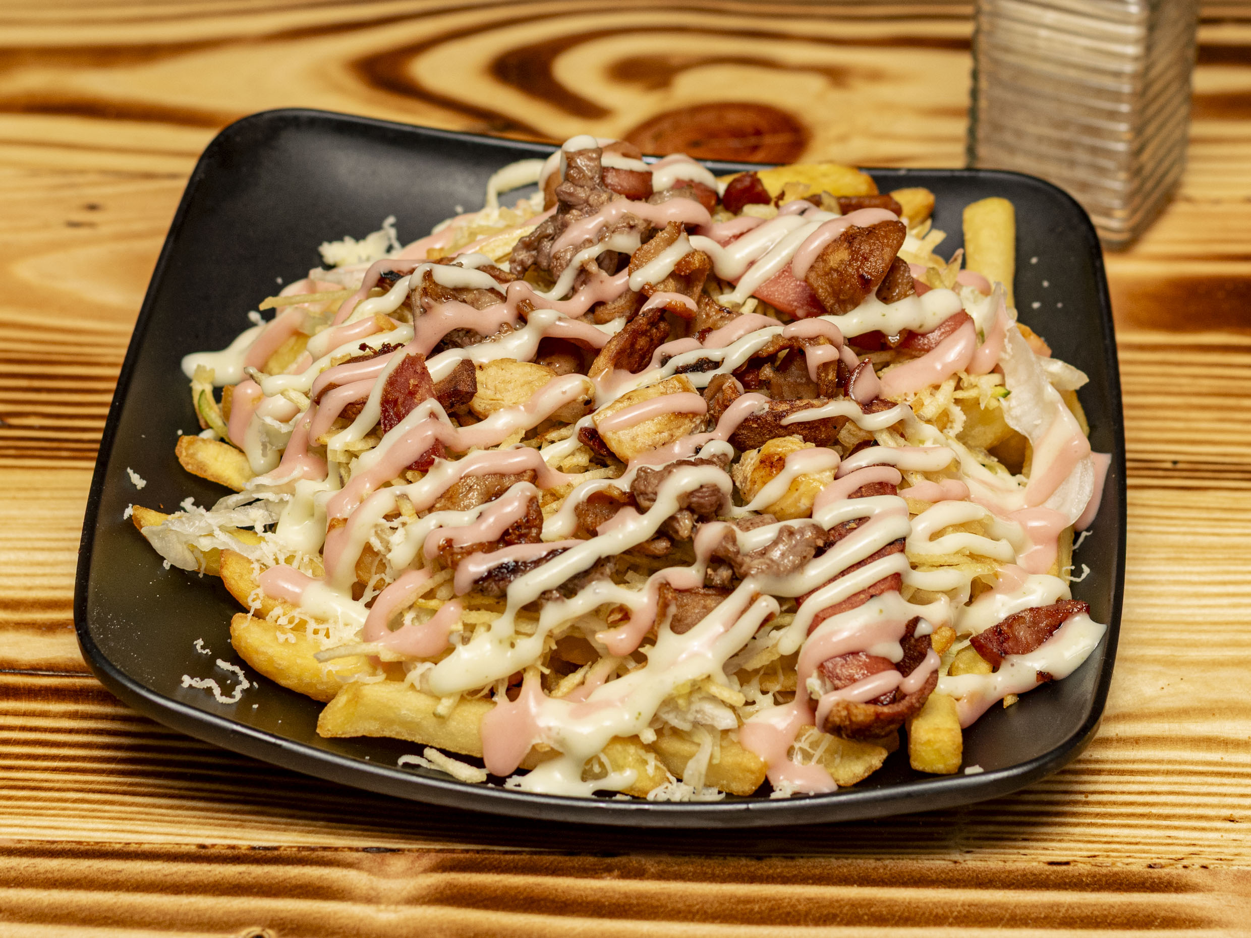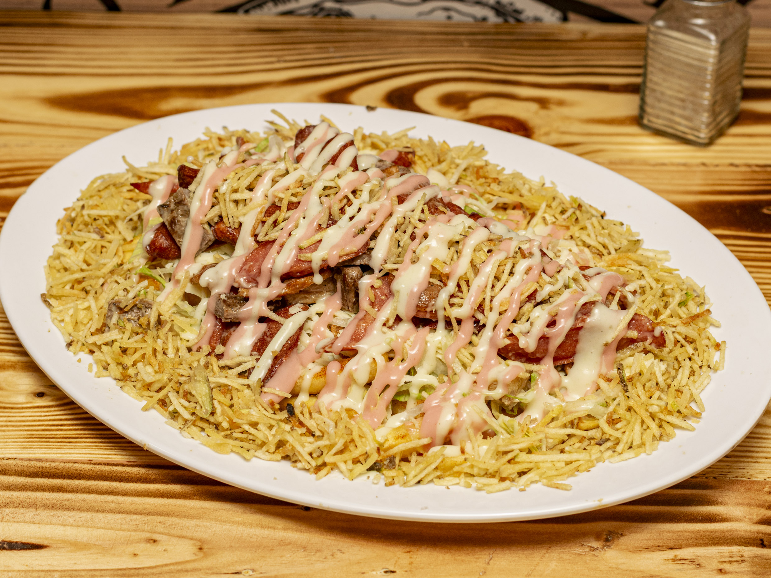 Salchipapa de la casa, salchicha, carne, pollo, chorizo, butifarra, lechuga, queso, papa chips, papa francesa y salsa de la casa.