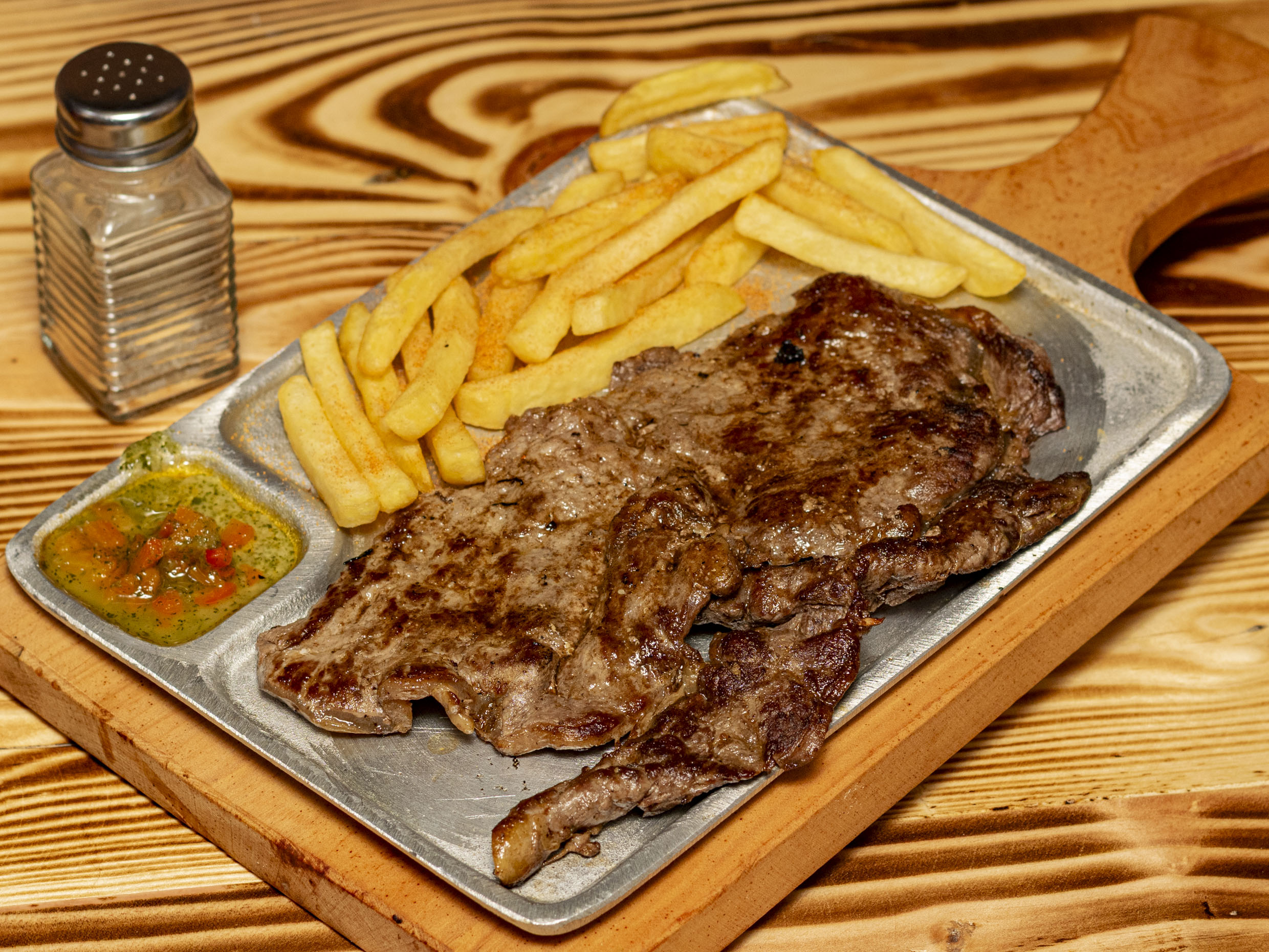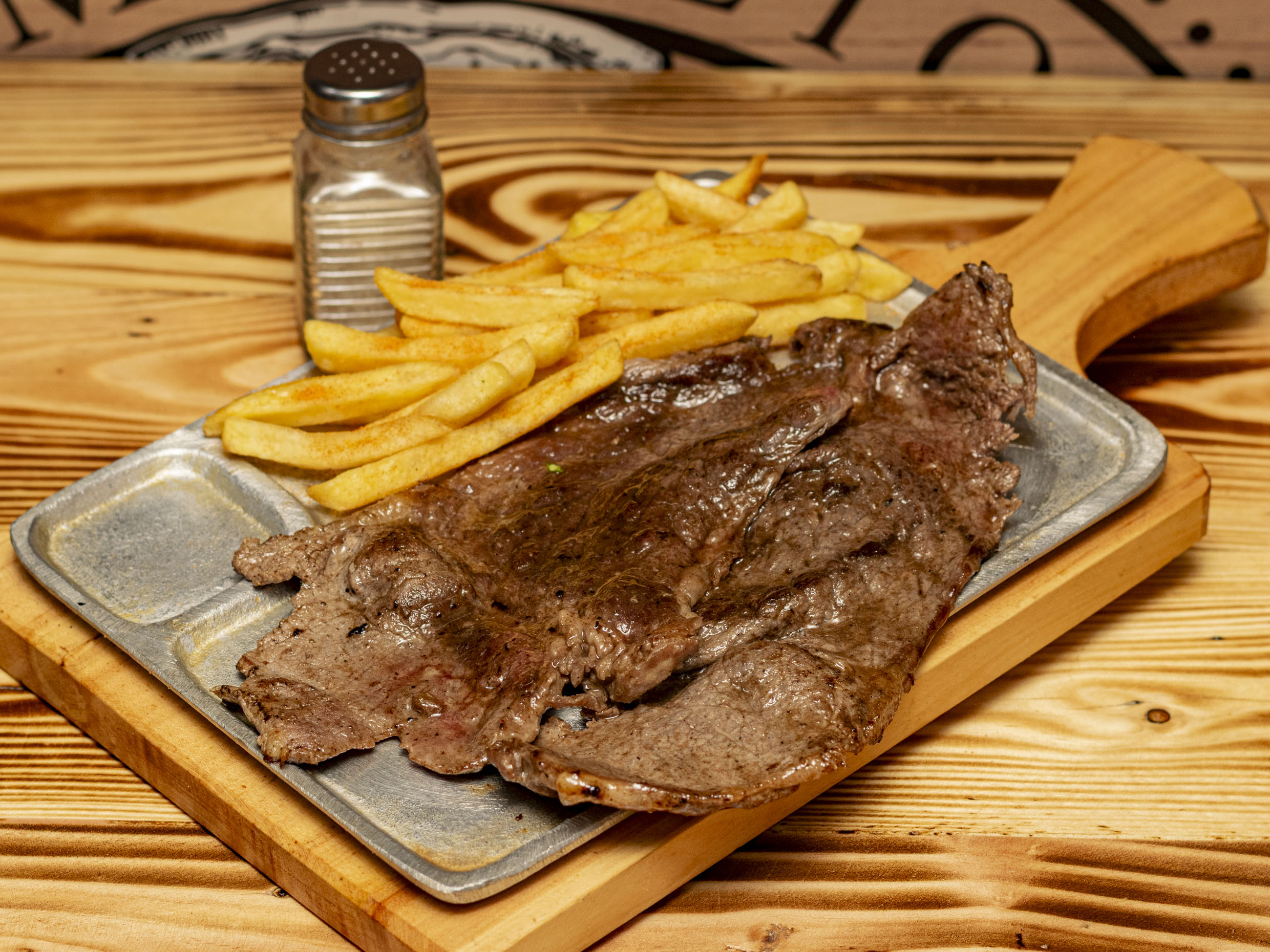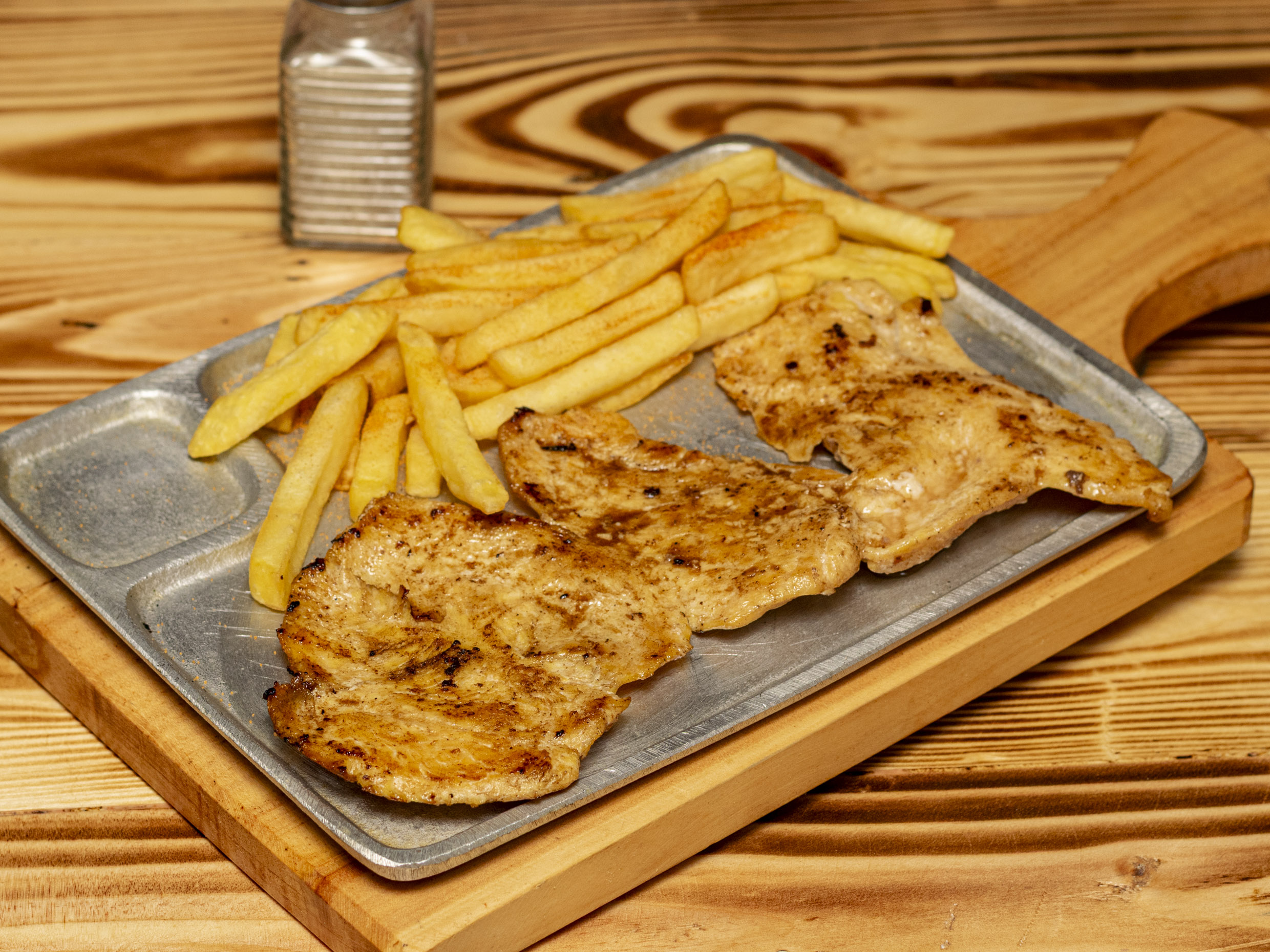 Acompañado de papa a la francesa y ensalada (cebolla, tomate, lechuga).