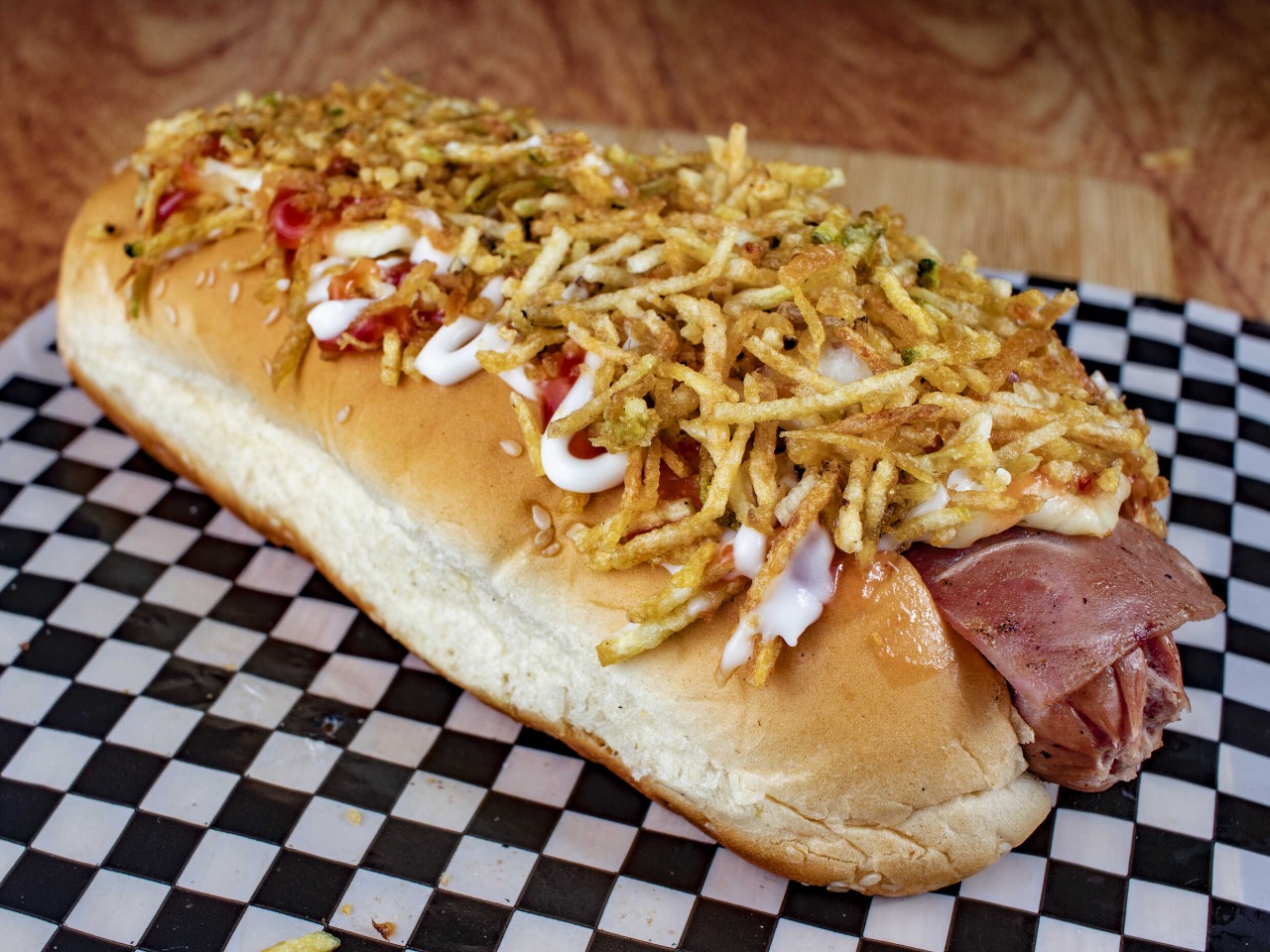 Salchicha americana, queso, cebolla, tocineta, papa chip, huevo de codorniz.
