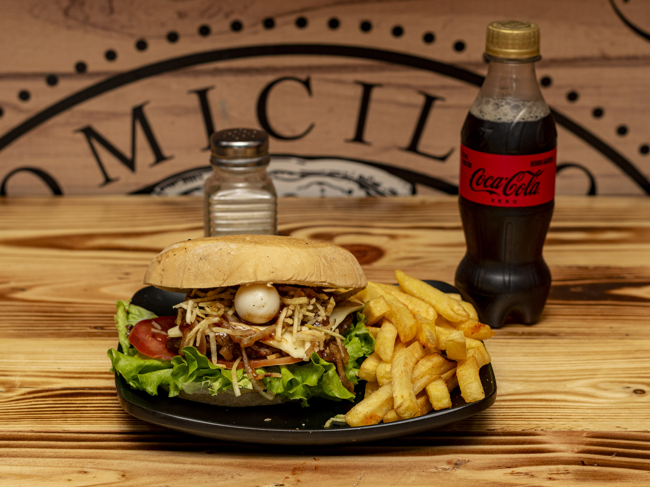 Carne 100% de res, lechuga, tomate, cebolla, pollo desmechado, queso, huevo de codorniz y papa chips. + Papas + Bebida
