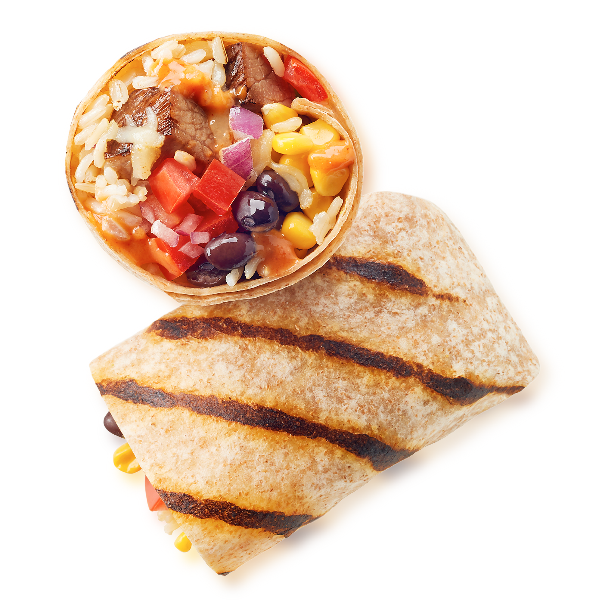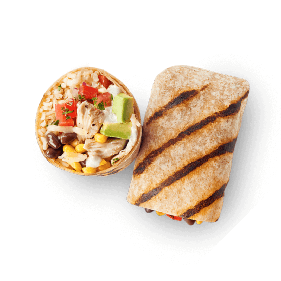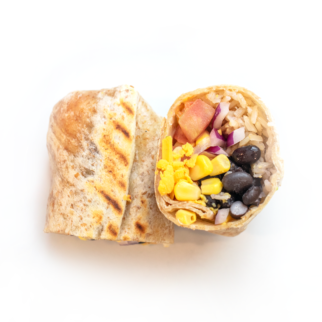 Tortilla integral rellena con arroz integral, fríjoles guisados, maíz dulce, aguacate, queso cheddar, pico de gallo y salsa ranch.