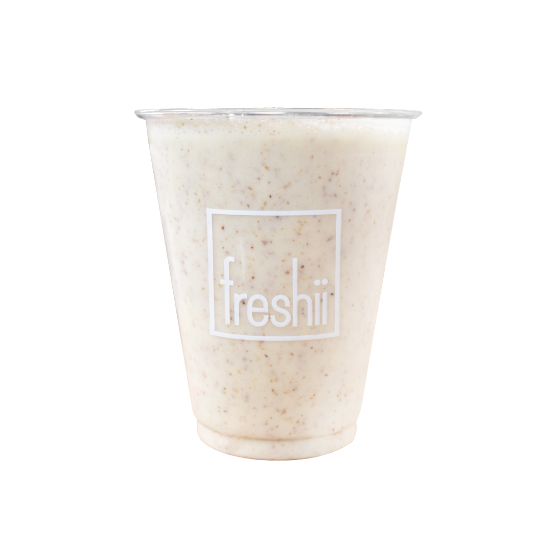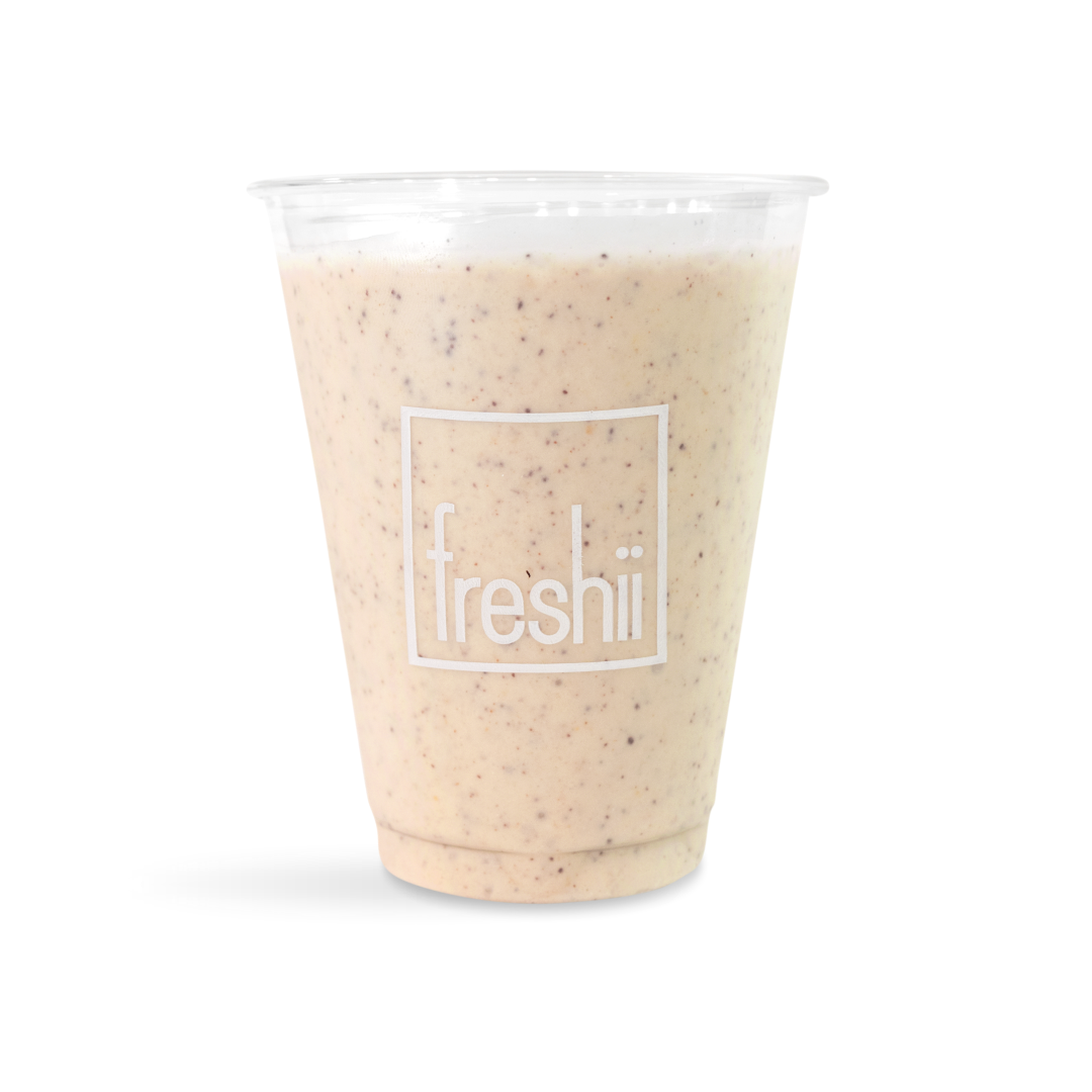 Banano, mantequilla de maní, avena, miel, chips de chocolate, leche de coco, hielo.