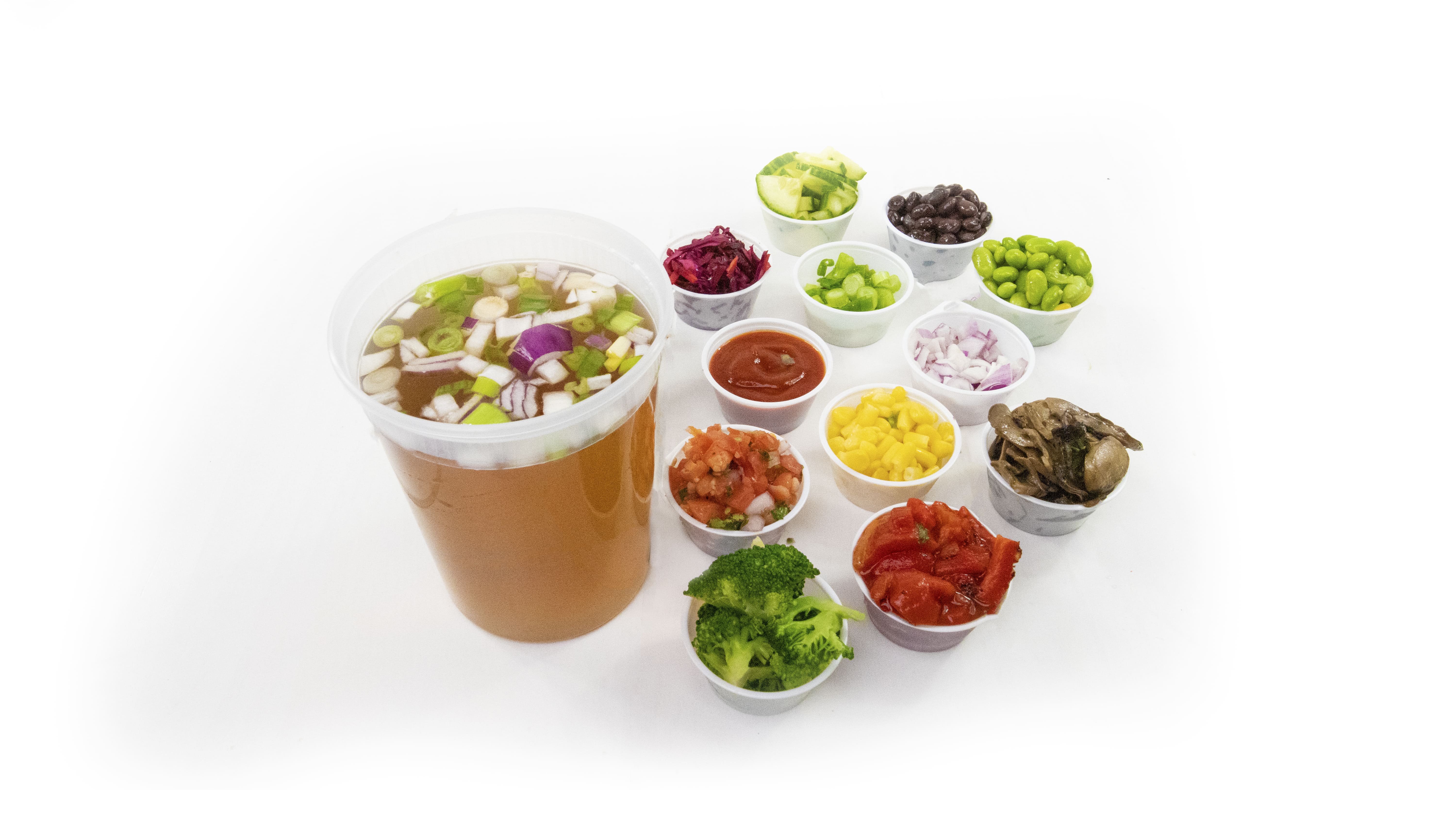 Caldo de vegetales, pasta de arroz, espinaca, maíz, edamame, zanahoria y apio.