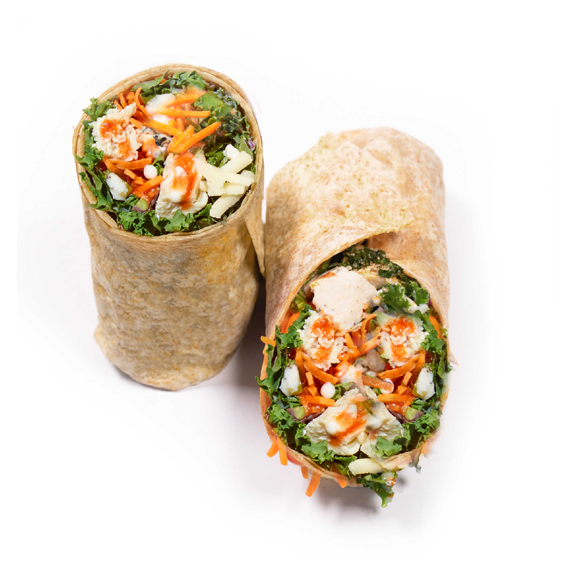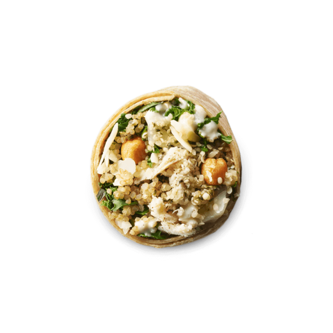 Tortilla Integral rellena de Kale, Lechuga Crespa, quinoa, garbanzo crocante, queso parmesano, limón y aderezo caesar de yogurt.