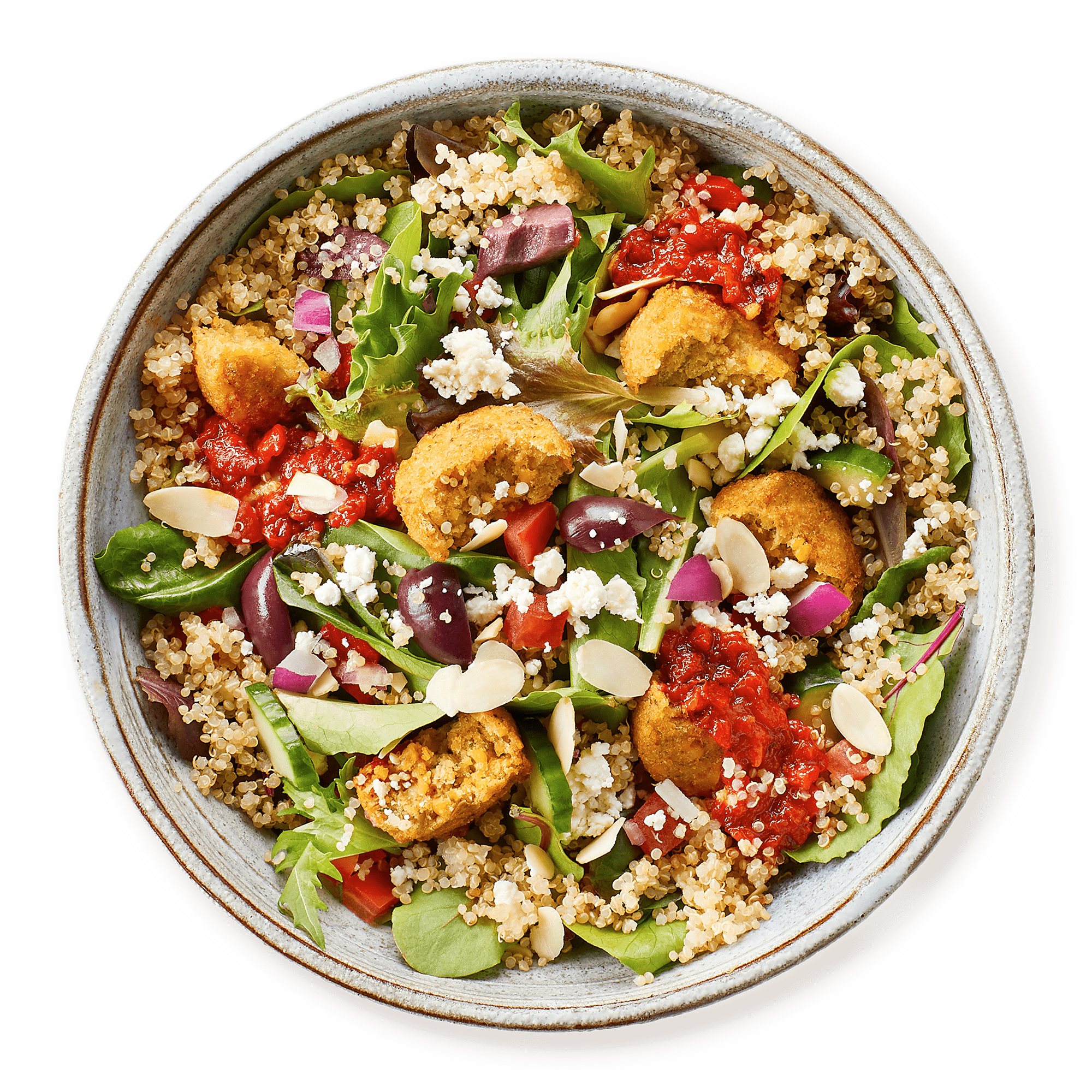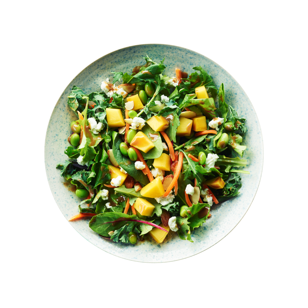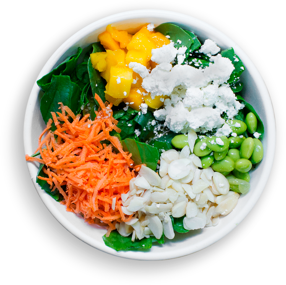 Espinaca, Lechuga Crespa, mango, zanahoria, edamame, almendras, queso feta y vinagreta balsámica.