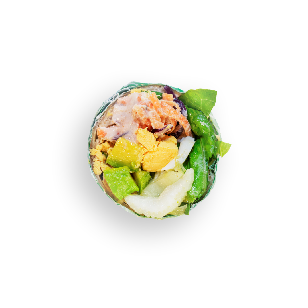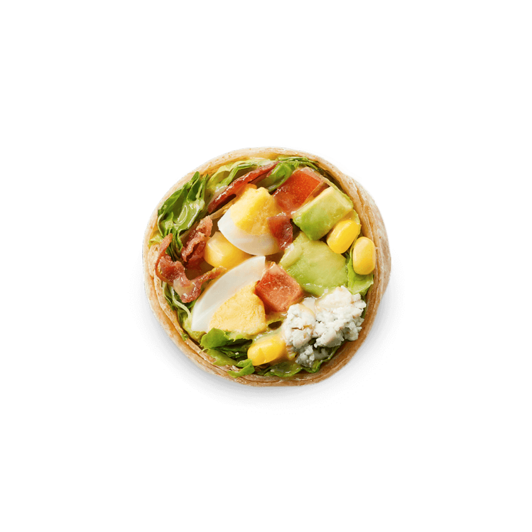 Tortilla Integral rellena de Lechuga Crespa, tocineta, huevo duro, aguacate, queso azul, tomate, maíz dulce y aderezo miel mostaza.