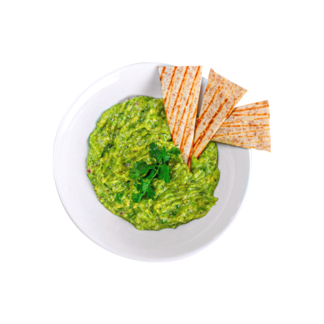 Guacamole hecho en casa acompañado de tortilla integral crujiente.